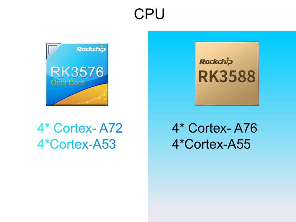 Výkon CPU: RK3588 používa štvorjadrový Cortex-A76 + štvorjadrová Cortex-A55, zatiaľ čo RK3576 používa štvorjadrový Cortexa72 + štvorjadrová architektúra Cortex-A53 pre náklady na náklady a je vybavená ARM Cortex M0 Coprocesorom, ktorý brzdí viac archibility na súvisiace aplikácie.