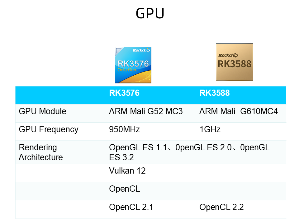 Obidve podporujú OpenGL ES 1.1, 2,0 a 3,2, Vulkan 1.2, ale RK3588 je vyšší vo verzii OpenCL (RK3588 podporuje 2.2).