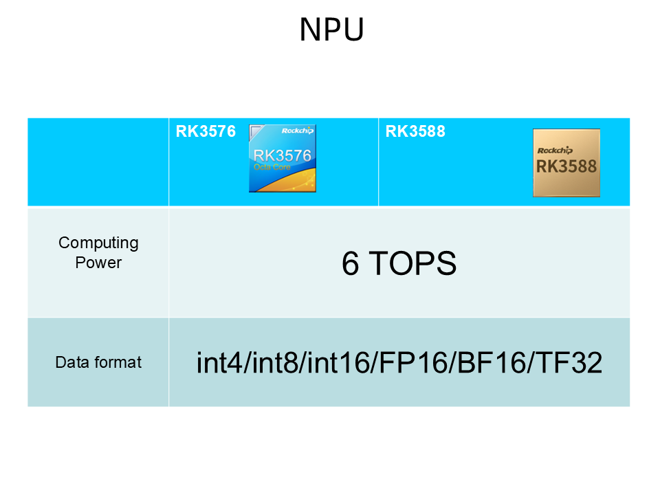 RK3588 a RK3576 sú vybavené výpočtovým výkonom 6TOPS, podpornými dátovými formátmi, ako je INT4INT8/INT16/FP16/BF16/TF32, a sú vhodné pre rôzne aplikácie AI aplikácie AI scenáre.