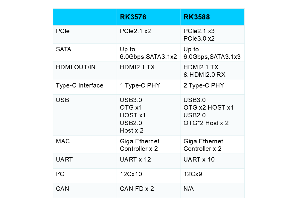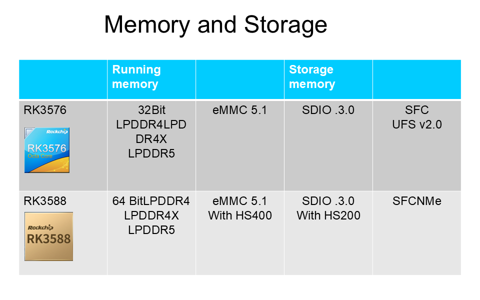 RK3588 podporuje64-bitLPDDR4/LPDDR4X/LPDDR5, EMMC5.1: s HS400, SDI03.0 s HS200 a NME a SFC. Obaja sa líšia v bitovej šírke pamäte (64bit oproti 32bit).