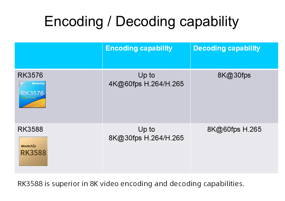 RK3588 podporuje až 8 000@60 snímok za H.265 a RK3576 podporuje až 8 k@30 snímok za sekundu.