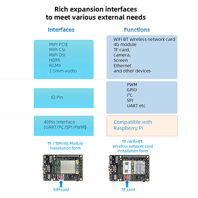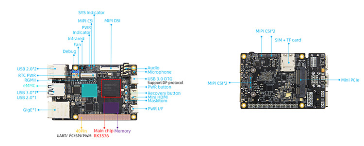 Na palube Gigabit Ethernet Port, RGMII, USB3.0/2,0, Mini Pcle, Mini HDMI, MIPI obrazovky a MIPI a ďalšie periférne rozhrania, ktoré vedú 40pinové nepoužité kolíky, bohaté rozširujúce rozhrania na uspokojenie ďalších vývojových potrieb!