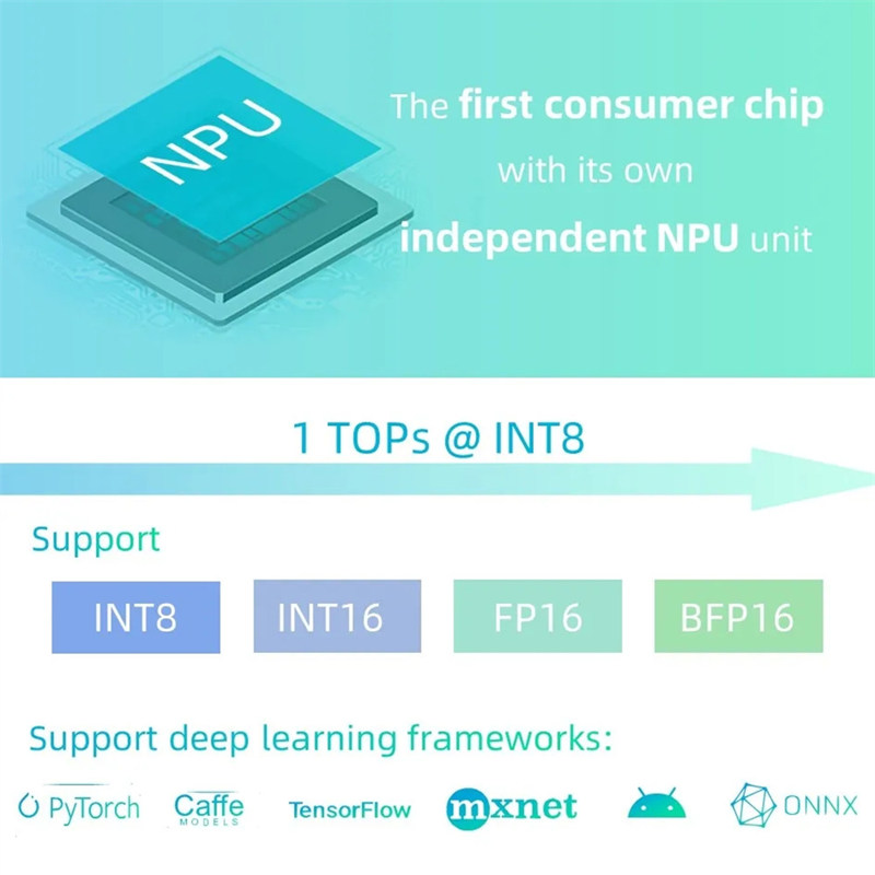 • GPU podporuje OpenGL ES3.2/2,0/1.1, vulkan1.1; VPU môže realizovať 4K 60 snímok za h.265/H.264/VP9 Video dekódovanie a 1080p 100fps H.265/H.264 Kódovanie videa; NPU podporuje Caffe/TensorFlow a ďalšie hlavné prepínanie modelov architektúry na jednom kliknutí.