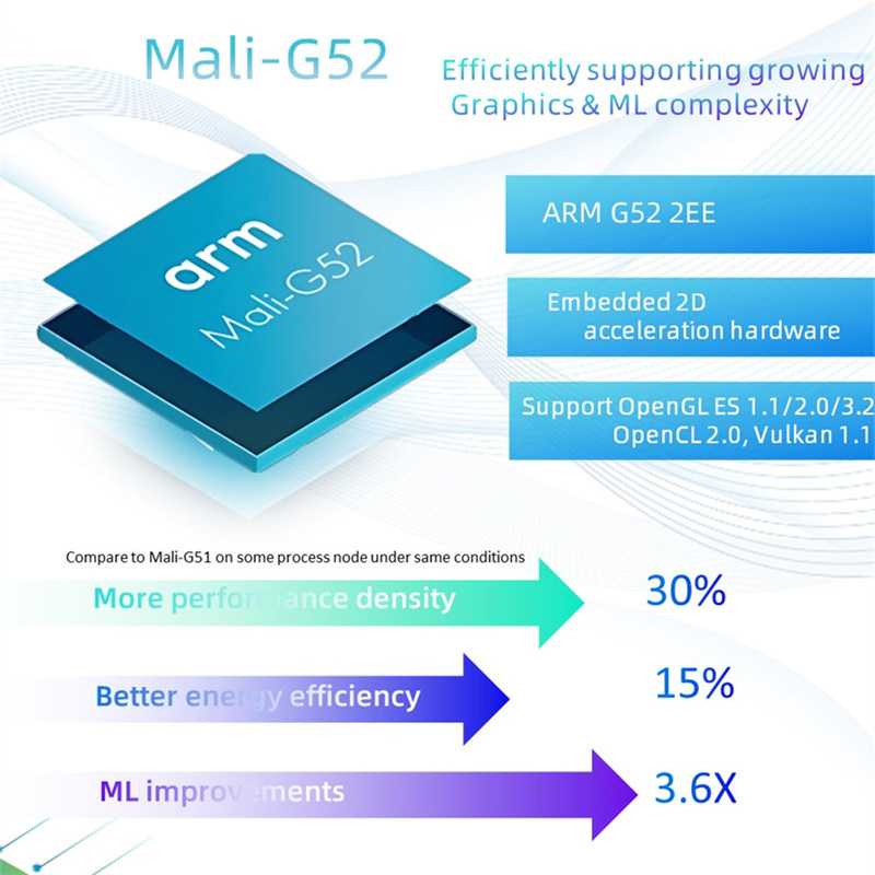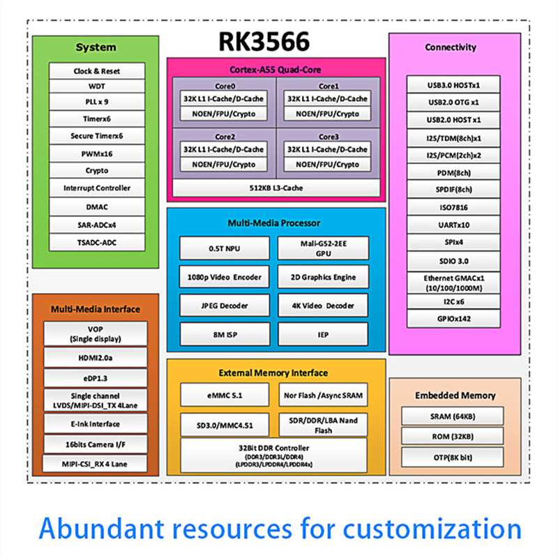 • RK3566 prijíma 22nm pokročilú technológiu s hlavnou frekvenciou až do 2,0 GHz, CPU môže byť vybavená až 8 GB pamäťou, ktorá môže dosiahnuť 32 -bitovú bitovú šírku a frekvenciu až 1600 MHz.