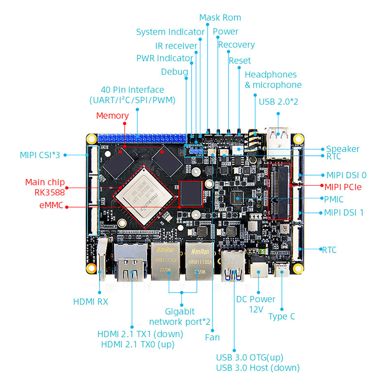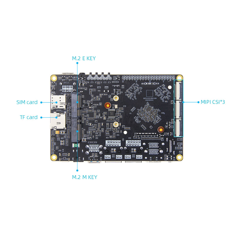 5. Vysoká integrácia, s bohatými rozširujúcimi rozhraniami, vybavenými gigabitovým ethernetovým portom, USB3.0, USB2.0, MiniPcle, MiniHDMI, MIPI rozhrania a rozhrania MIPI, audio rozhrania, infračerveného recepcie, držiteľa kariet TF atď.